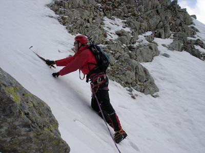 Fin du rocher pour nous, crampons , Franck me propose un couloir raccourci plus raide, on tente mais après quelques pas je ne suis pas si à l'aise, il neige à gros flocons et le brouillard arrive, je ne peux pas prendre mon temps, ça me stresse, changement de couloir moins raide,
