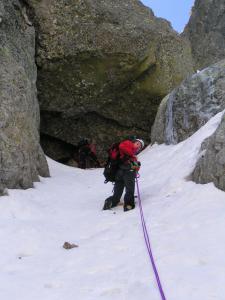 Particularité : le couloir est coupé en 2 par un rocher rond couvert d'une fine couche de glace, possibilité d'assurer dans une « grotte » sur le coté, exceptionnellement beau.