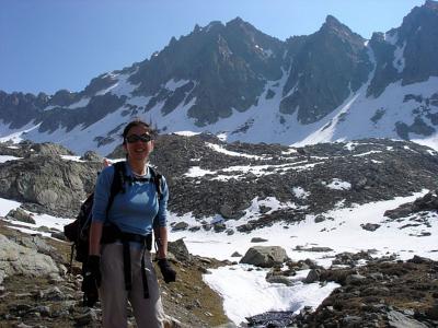 J'attaque la descente, pur bonheur du bon rocher, puis petit couloir de neige (couloir de la brèche de Brocan ?), descente jusqu'au col de Guilié, c'est vierge, silencieux, splendide. J'apprécie le sens de l'orientation de Laurent et son GPS hight tech pour nous ramener au gite du Boréon.