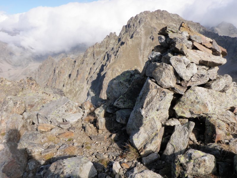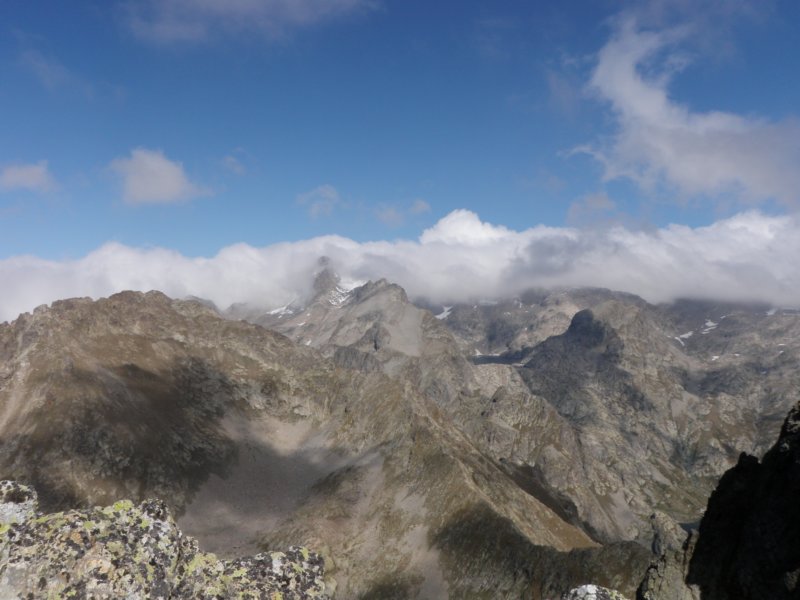 Le rappel sur la brèche est rock'n'roll, je fais l'erreur de jeter la corde qui part aussitot a l'horizontale s'accrocher a tout les becquets possibles.Le vent et le froid et les fringues mouillées nous font renoncer a l'arête du Neiglier. Une petite pause au soleil nous incide à repartir et c'est par sa voie normale que nous ferons l'ascension du Neiglier.L'hiver, arrive à grand pas, On devine Grand Capelet et Gelas deja platrés.