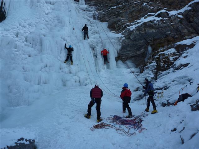 Au pied de la cascade, on cherche les lignes. A gauche pas assez de glace. Puis en se décalant vers la droite, soit c'est la douche assurée, soit c'est une belle draperie, mais qui semble bien trop fine pour supporter notre passage, les choux fleurs au dessus présageraient aussi de bons moments a essayer de brocher !