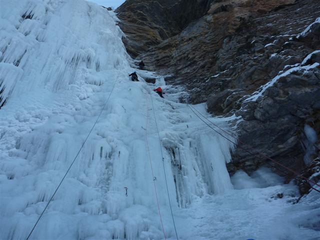 On essaye donc les 3 lignes de droite qui ont l'avantage d'avoir déjà les "relais" en place. Avec Antoine et Yom on pose les trois lignes qui se schématisent de la même façon : un départ vertical sur 4-5m, puis ça s'incline avec une glace changeante et une arrivée au relais peu fournie en glace. C'est donc un grand moment que de faire les rétas en crochetant sur la glace sans pouvoir vraiment ancrer les piolets. Plus la ligne est a gauche, plus elle est longue, plus la fin est fine... ambiance !