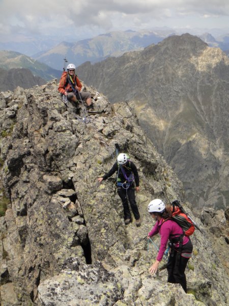 15 mn de marche sur la crête nous amène au pied des difficultés, l'arête, sans être difficile est de plus en plus aérienne et effilée.