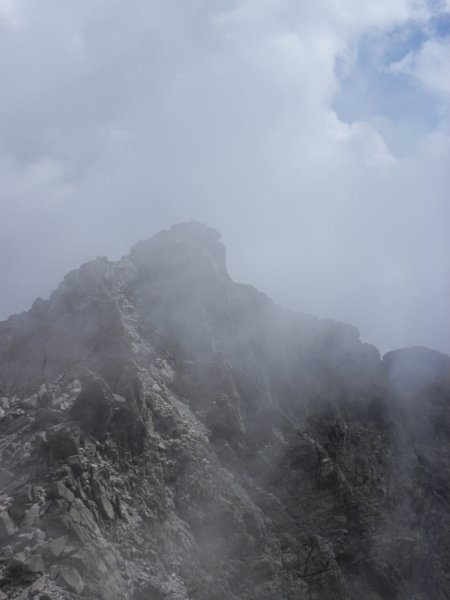 Finalement la météo se maintient malgré quelques passages de nuages, nuages qui encapuchonnent tous les sommets alentour. L'ojectif final se laisse apercevoir, on continue jusqu'au bout par les arêtes histoire de prolonger le plaisir.