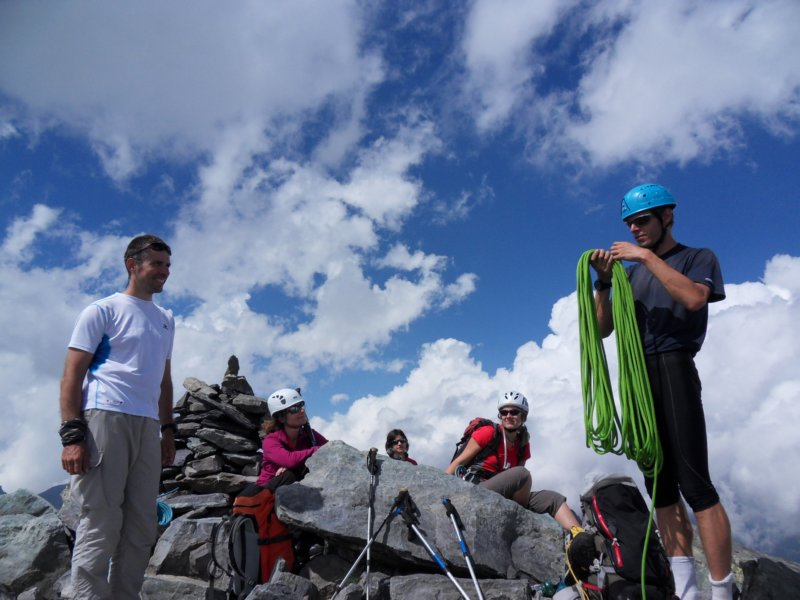 Pointe Vernet, il est environ 14h, cela fait presque 4h qu'on a démarré la grimpe. Le ciel s'est chargé, surtout le nord, la Cougourde est dans les nuages ainsi que l'Italie. Petite pause pour l'équipe.
