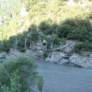 La sortie débute par une jolie traversée sur la passerelle tendue au dessus d'un Var grossi par la fonte des neiges et les orages de la veille en montagne. Elle se poursuit par une courte marche d'approche de 30mn pour atteindre le départ.