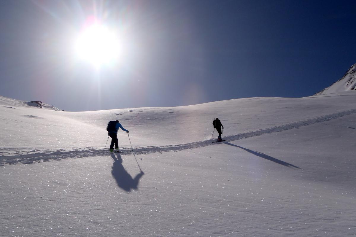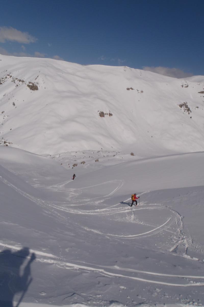 A la descente, succession de poudre tassée et de neige durcie par le vent. Très agréable à skier tout de même.