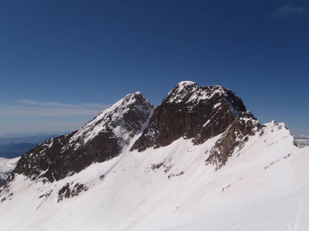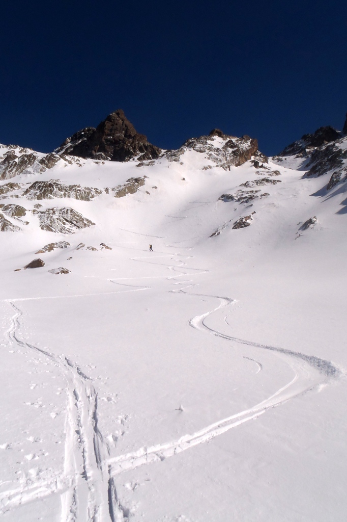 La montée se passe bien, il a neigé la veille : 5 à 10 cm de poudreuse, les sommets sont un peu plâtrés et avec le ciel bleu, c’est magnifique ! Il n’y a personne, juste 2 collants pipettes qui nous doublent à une allure impressionnante ! Des échappés de la Pierra Menta peut être ;-)